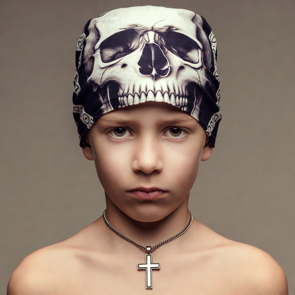 White, bandana, beige background, child, cross necklace, cross pendant, headwear, male, necklace, neutral expression, serious face, shirtless, silver chain, skull bandana, skull print, young boy, boy