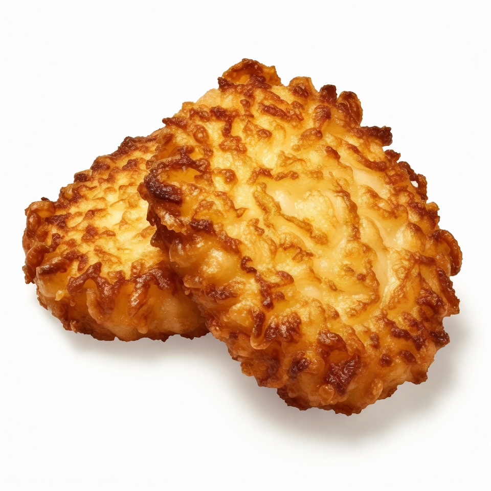 Two golden-brown coconut macaroons with textured, shredded coconut surfaces are stacked together. They feature a crispy exterior and moist interior, isolated on a white background. The cookies have a rustic, irregular shape typical of traditional baked goods.