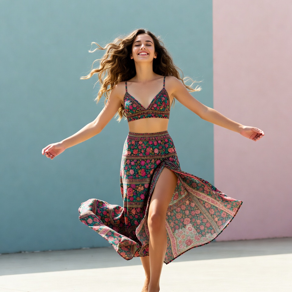 A young woman with long wavy brown hair smiles joyfully while twirling in a colorful floral-print two-piece outfit featuring a strapless bralette and high-slit skirt. Her skirt flares out dynamically as she moves, set against a teal and pink geometric wall with a light floor. She has tanned skin and is captured mid-motion with arms outstretched.
