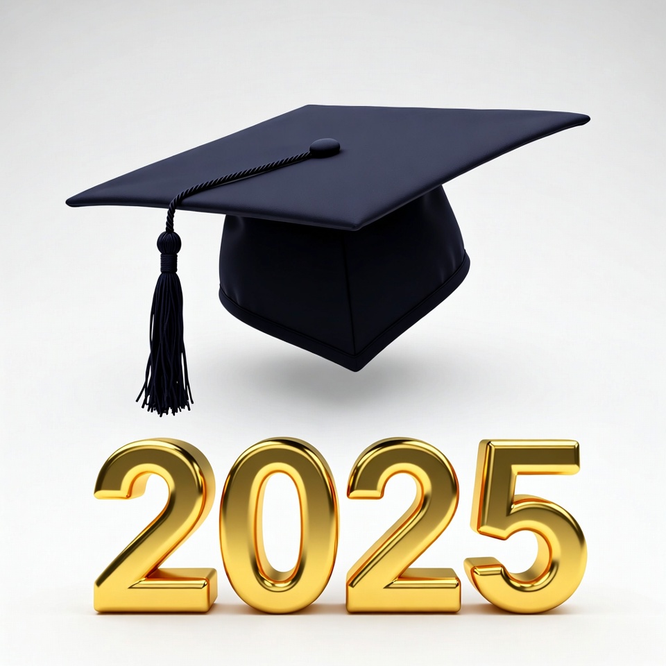 A black graduation cap with a tassel floats above golden 3D numbers spelling 2025. The cap features a square mortarboard design and hangs on a white isolated background. The elements are rendered in a 3D illustration style.