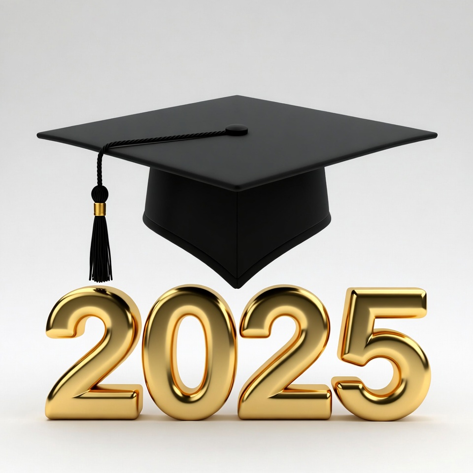 A black graduation cap with a gold tassel is positioned above large golden numbers spelling '2025'. The cap features a square mortarboard design with a tassel hanging from the corner. The elements are rendered in a 3D illustration style on a white background.