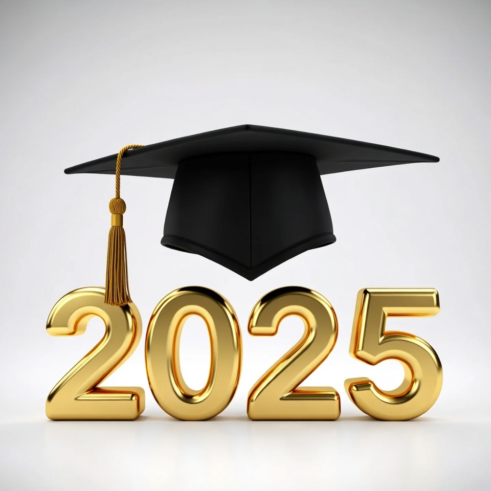 A black graduation cap with a gold tassel sits above large golden numbers spelling '2025'. The elements are centered on a plain white background. The design features a 3D metallic style for the numbers and realistic shading on the cap.