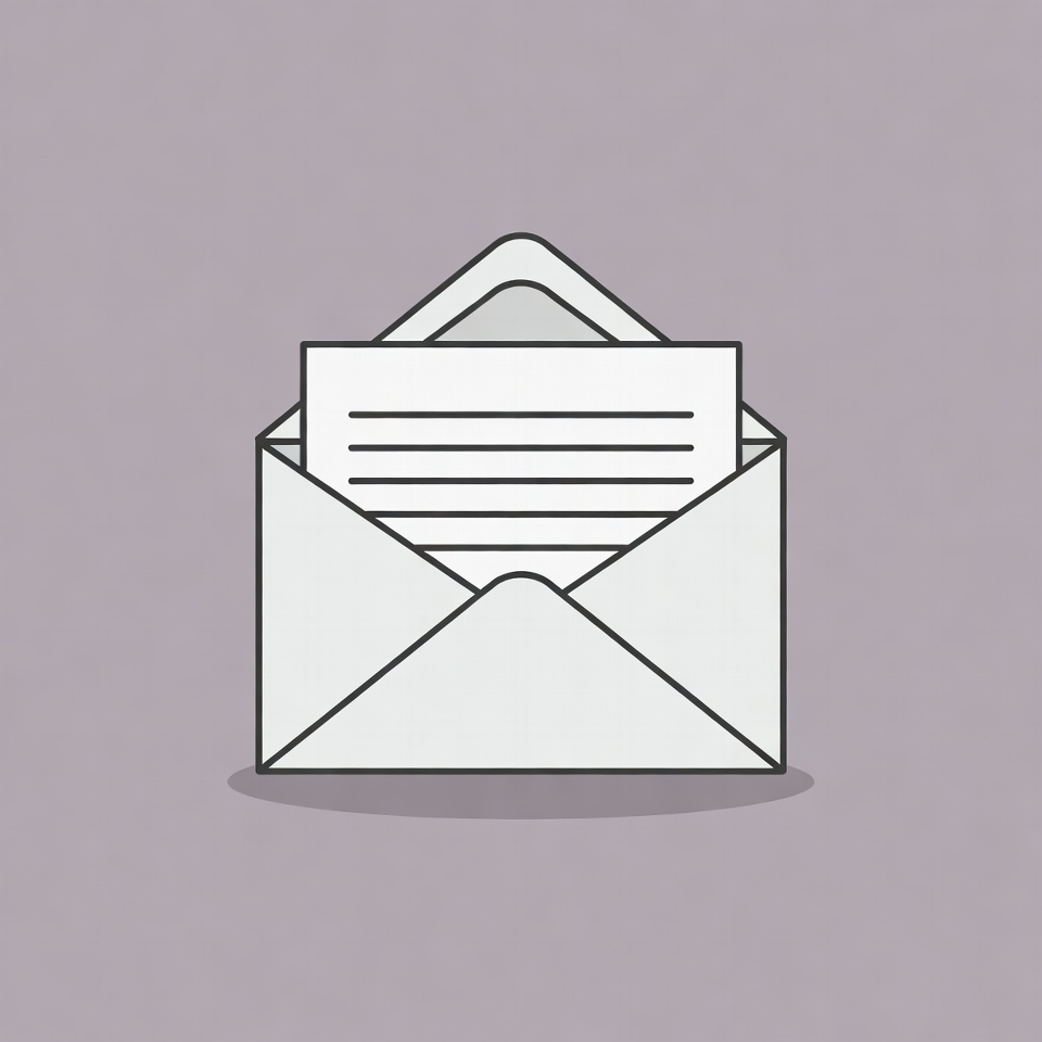 A simple line art illustration shows a white envelope opened with a folded letter inside. The envelope flaps are spread apart on a solid purple background. Horizontal lines represent text on the letter paper.