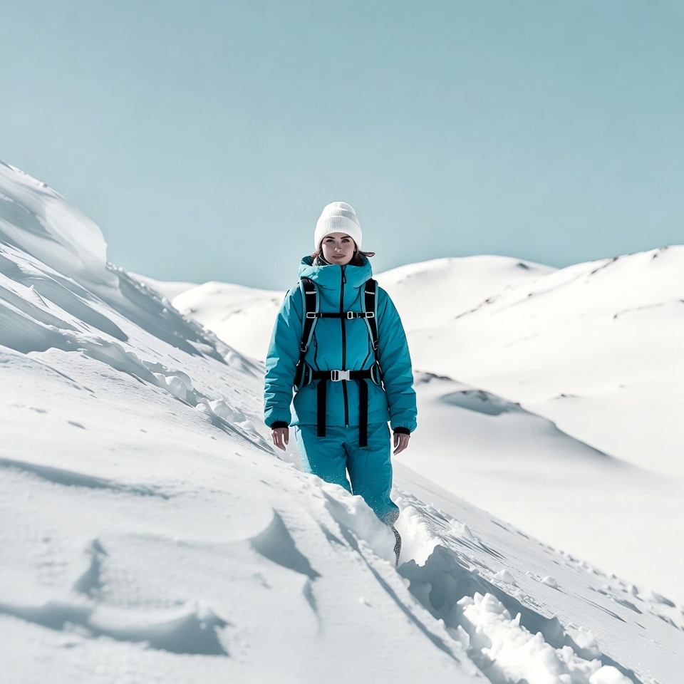 White, alpine, backpack, blue jacket, clear sky, cold weather, expedition, female, frost, glacier, hiking, insulated clothing, mountains, outdoor adventure, peak, puffy jacket, ski suit, skier, snow slope, snowy mountains, trekking, white beanie, winter, woman