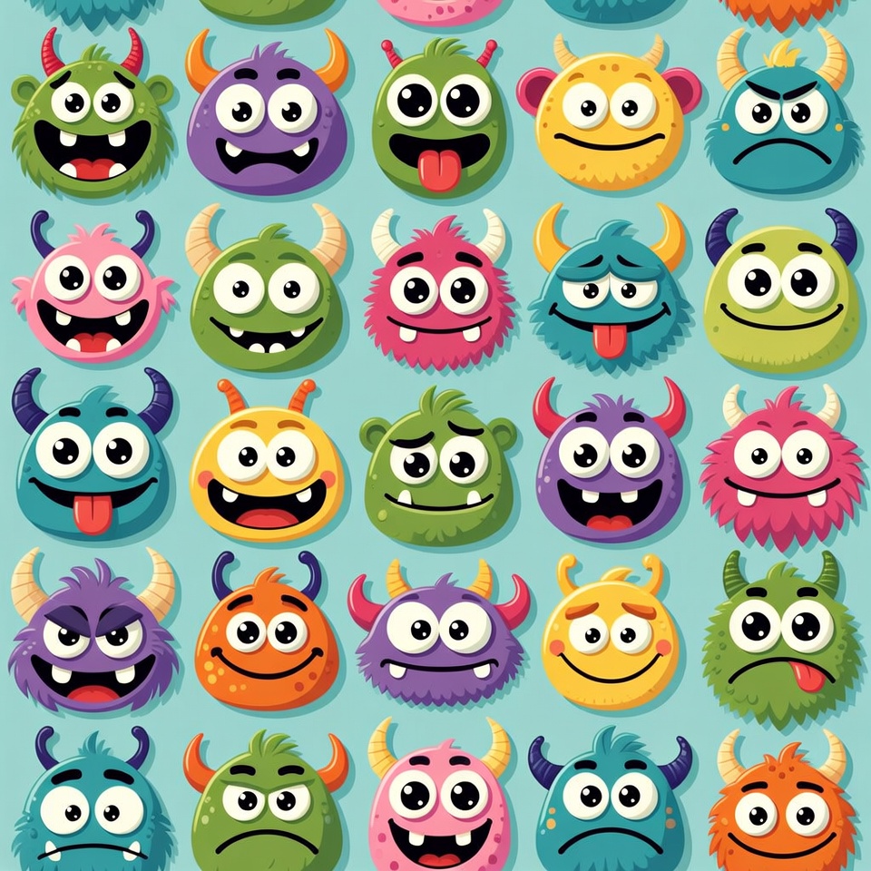 big eyes, clipart, colorful monsters, cute monsters, funny monsters, furry monsters, green monster, grid pattern, horns, illustration, isolated background, monster faces, orange monster, pattern, pink monster, playful, purple monster, smiling monsters, whimsical, yellow monster, cartoon monsters