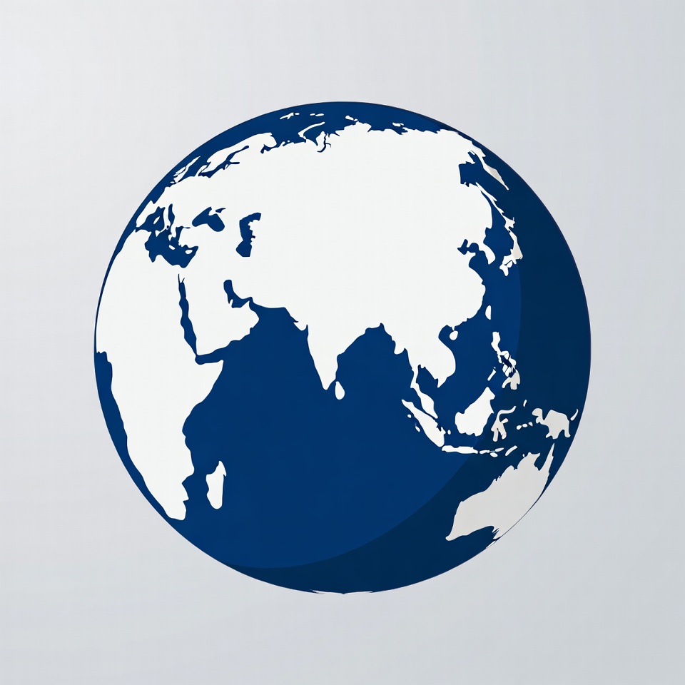 A simple vector illustration of Earth as a globe on a light gray background. The continents are depicted in white against a navy blue ocean. The design features clean lines and a partially shadowed effect.