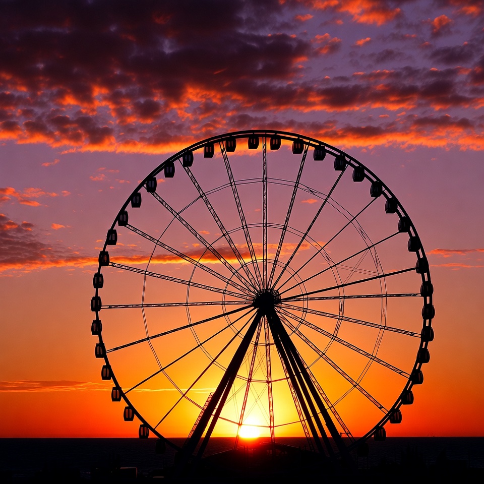 A large Ferris wheel stands in silhouette against a vibrant sunset sky with orange, purple, and pink clouds. The sun is setting behind the wheel, casting a warm glow over the scene. The image captures the wheel's structure clearly outlined against the colorful horizon.