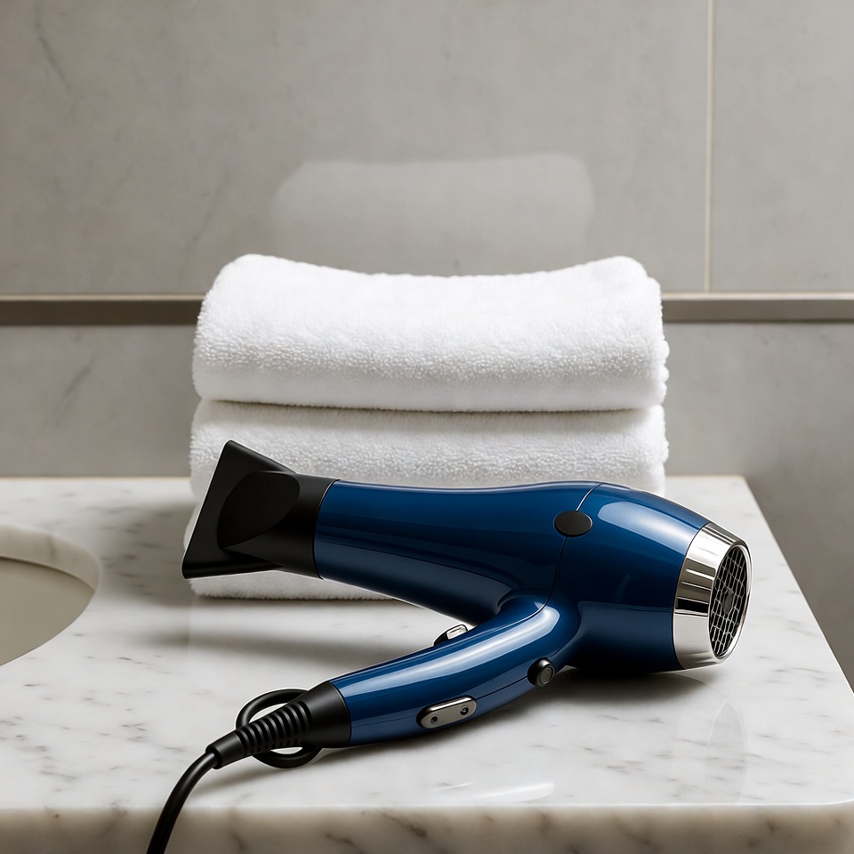 Blue Hair Dryer on Bathroom Counter