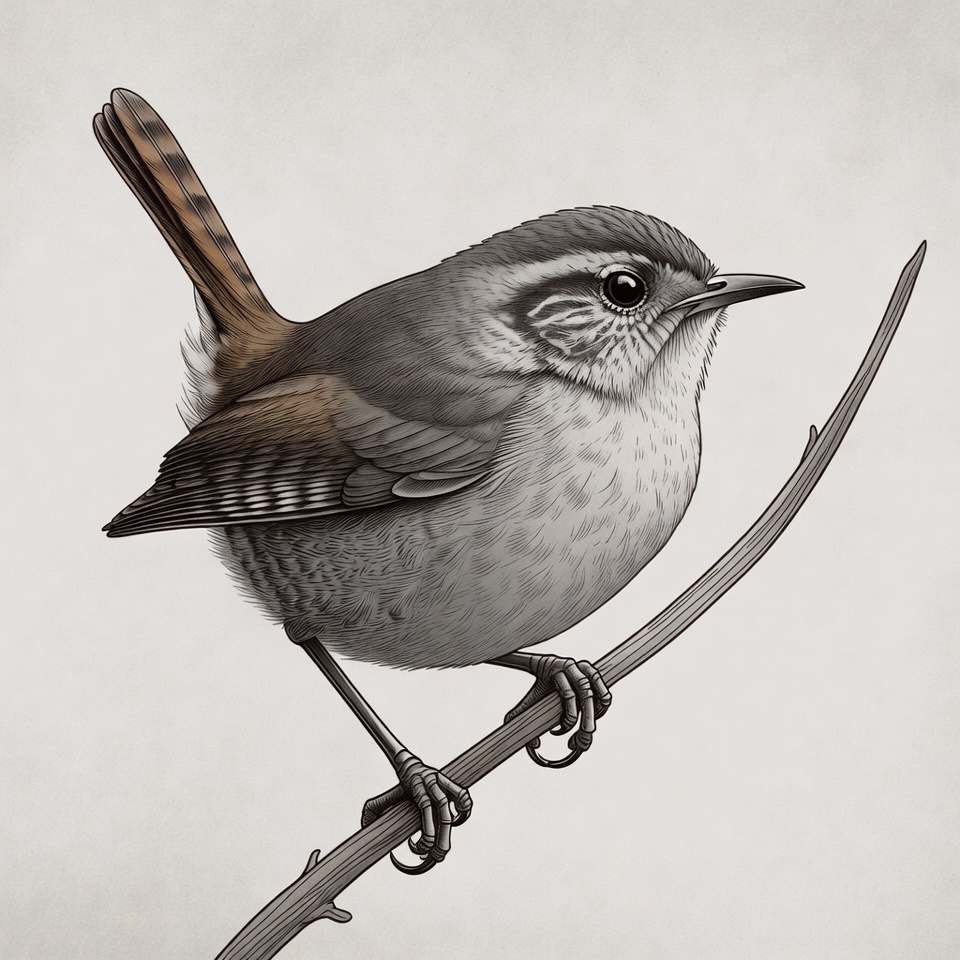 avian, bird claws, bird drawing, bird feathers, bird illustration, brown bird, curved bill, detailed bird, gray bird, isolated background, nature illustration, perched bird, rufous tail, small bird, songbird, thin branch, white eyebrow, wildlife art, wren bird, Bewick's Wren