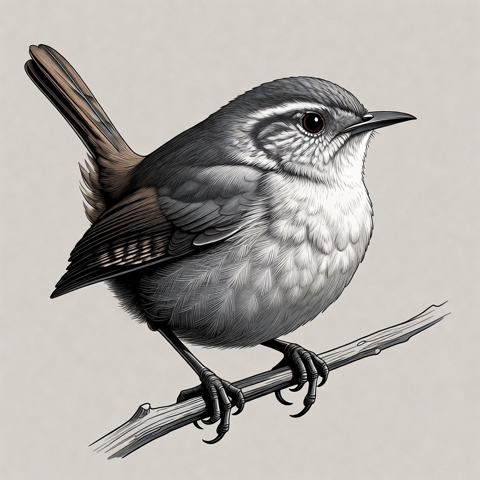avian, bird, bird on branch, brown tail, clipart, feathers, gray bird, illustration, isolated background, nature, perched bird, small bird, talons, white eyebrow, wildlife, wooden branch, wren