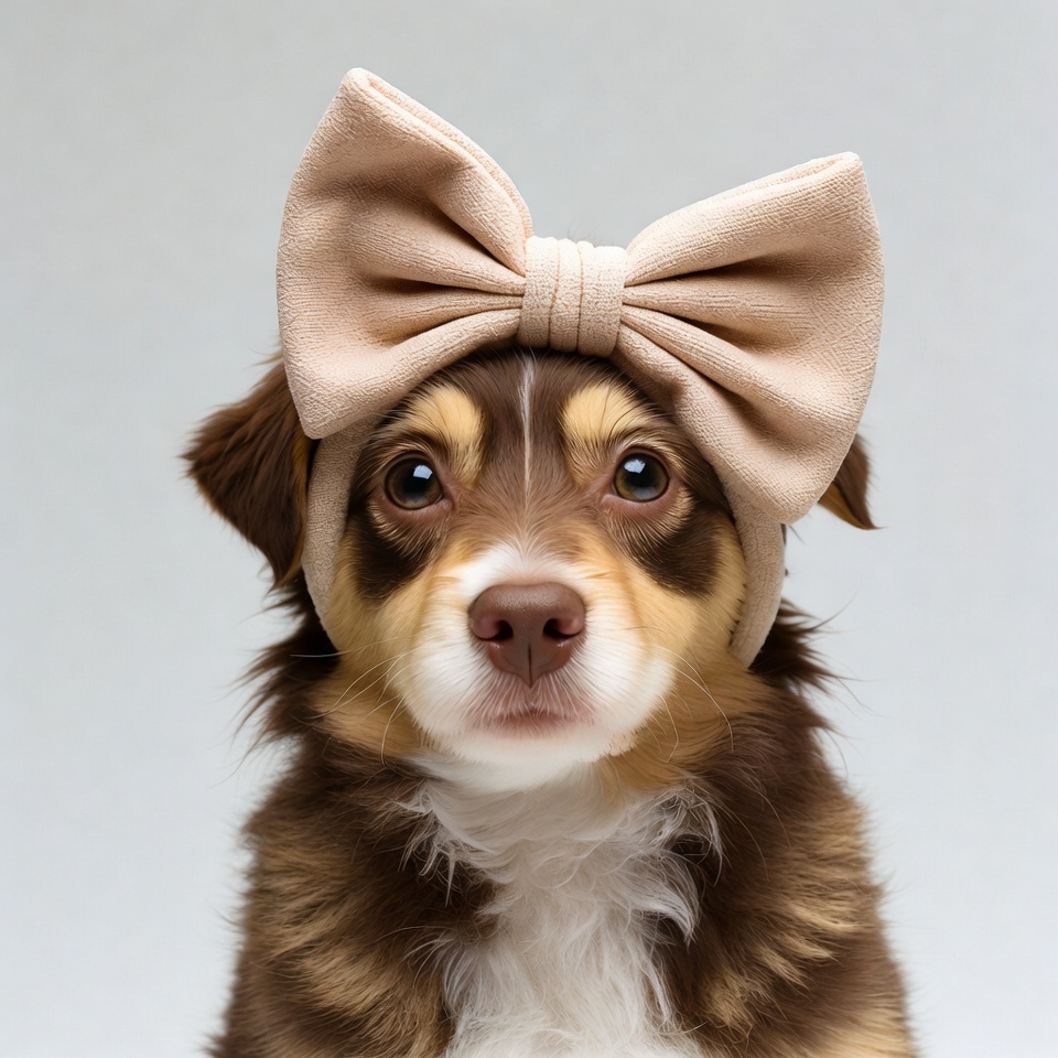 A cute Australian Shepherd puppy with brown, black, and white fur wears a large beige fabric bow on its head. The puppy has expressive eyes and a fluffy coat, posed directly facing the camera. It stands against a plain white background.