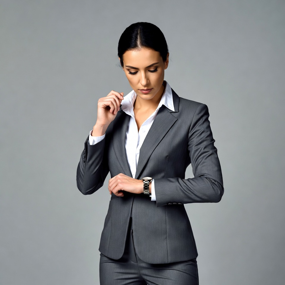 A woman with dark hair in a gray suit and white blouse stands against a gray background, adjusting her white collar with one hand. She looks down thoughtfully while checking the time on her silver wristwatch with her other hand. Her professional attire includes tailored pants and a fitted blazer.