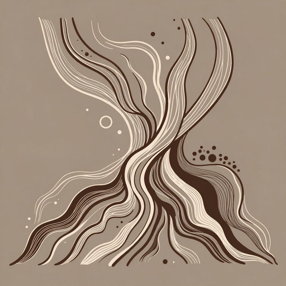 An abstract illustration features swirling, flowing lines forming tree roots and branches in brown and beige tones. Small dots and bubbles accent the organic shapes against a solid tan background. The design emphasizes fluid, curved strokes creating a natural, root-like structure.