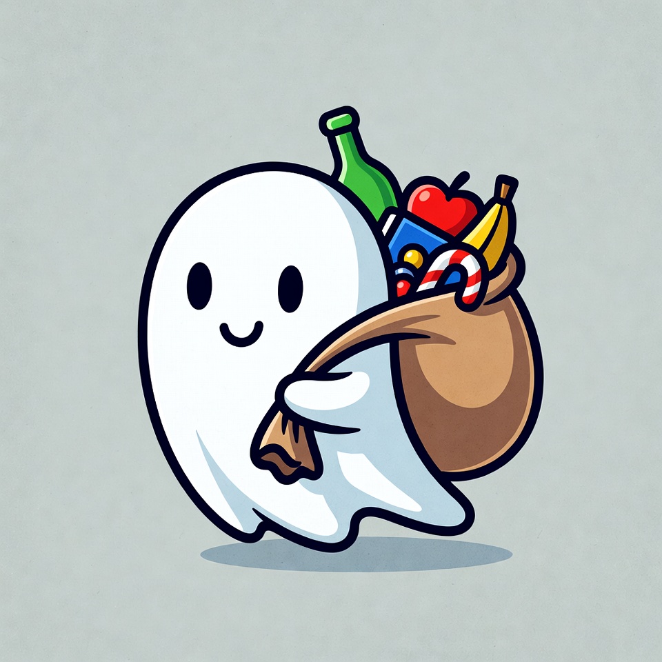 A cute white ghost with big smiling eyes holds a brown sack overflowing with Halloween treats. The bag contains colorful candies, candy canes, a green bottle, red apple, and bananas. The illustration features a simple gray background.