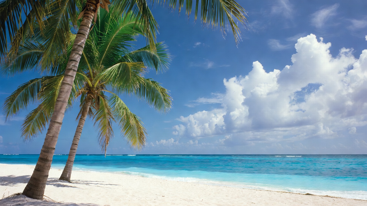 beach, blue sky, caribbean, clear water, coast, exotic, green leaves, horizon, idyllic, landscape, nature, ocean view, palm fronds, paradise, sandy beach, seascape, shoreline, summer, sunny, travel, tropical, turquoise ocean, vacation, waves, white clouds, white sand, palm trees