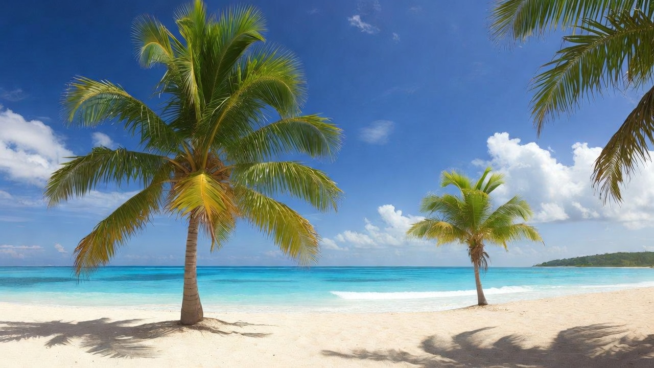 beachfront, blue sky, caribbean, clear water, clouds, coast, exotic, green palms, idyllic, landscape, nature, ocean view, paradise, resort, sandy shore, seaside, shoreline, summer, sunny, travel, tropical beach, turquoise ocean, vacation, white sand, palm trees