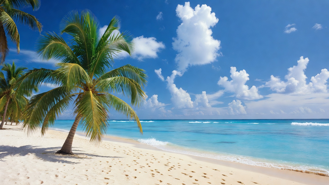 beach scene, beachfront, blue sky, caribbean beach, clear sky, coast, coconut palms, footprints, idyllic beach, nature, ocean waves, palm fronds, paradise beach, sandy beach, seaside, serene beach, sunny beach, travel, tropical beach, tropical paradise, turquoise ocean, vacation spot, white clouds, white sand, palm trees