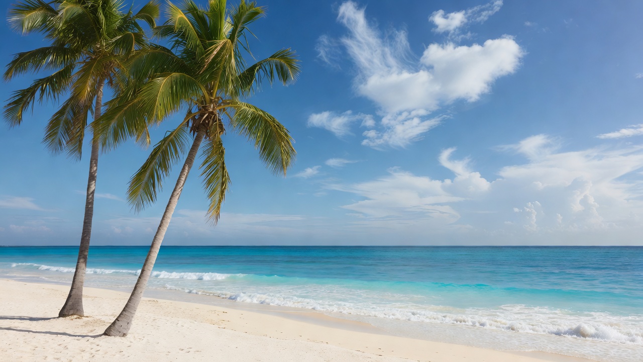 Two tall palm trees with green fronds stand on a white sandy beach. Gentle waves lap at the turquoise ocean under a clear blue sky with scattered white clouds. The scene captures a pristine tropical shoreline.