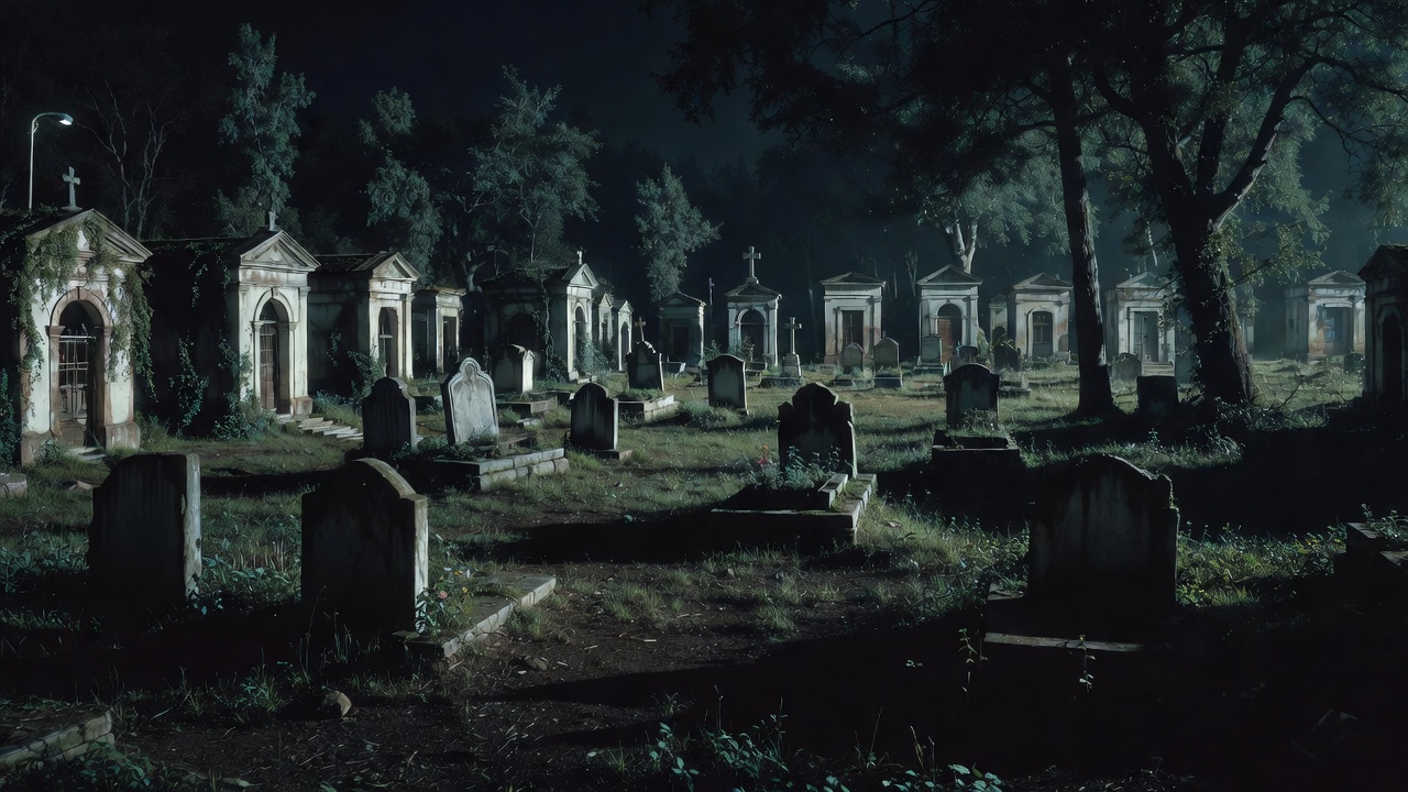 A dark cemetery at night features numerous weathered tombstones and moss-covered mausoleums scattered across the foggy ground. Tall trees with twisted branches frame the scene under a dim streetlamp glow. Crosses and overgrown paths add to the isolated, atmospheric landscape.