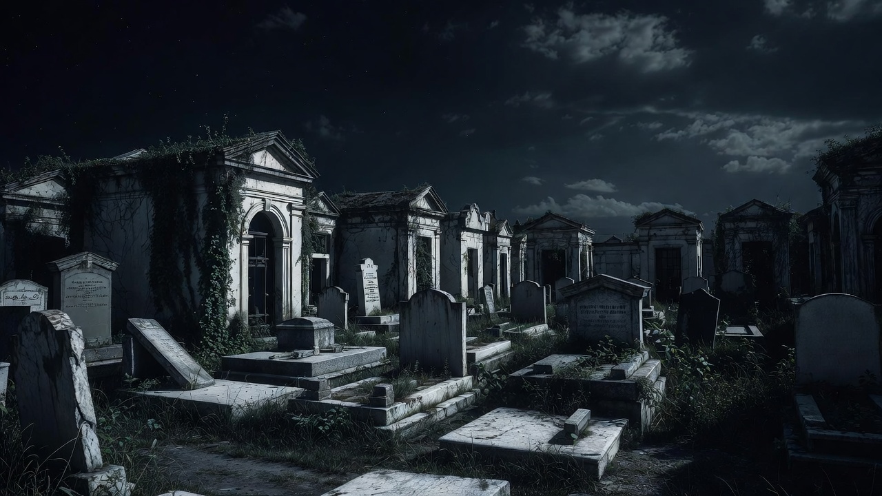 An old abandoned cemetery features numerous weathered tombstones and mausoleums overgrown with ivy. The scene is shrouded in darkness under a cloudy night sky. Cracked stone structures and scattered graves create a spooky, desolate atmosphere.