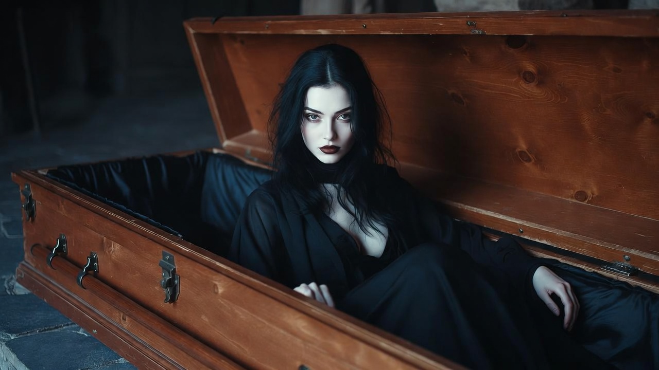 White, black dress, black hair, coffin, dark background, dark makeup, female, goth, gothic, horror, isolated background, long hair, lying down, open coffin, pale skin, sheer dress, vampire, wooden coffin, woman