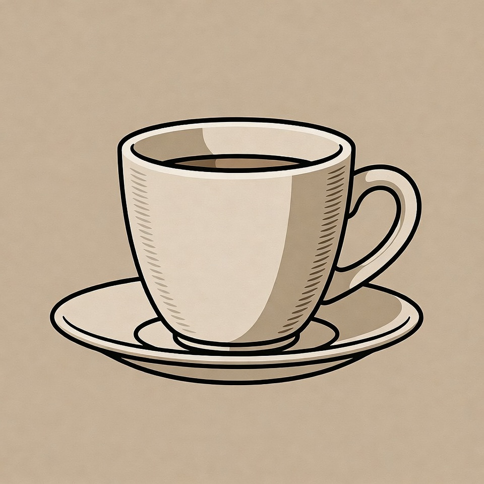 A simple line art illustration of a white ceramic coffee cup filled with dark coffee sits on a matching saucer. The cup features a textured surface and a curved handle. It is depicted on a beige background with subtle shading for depth.