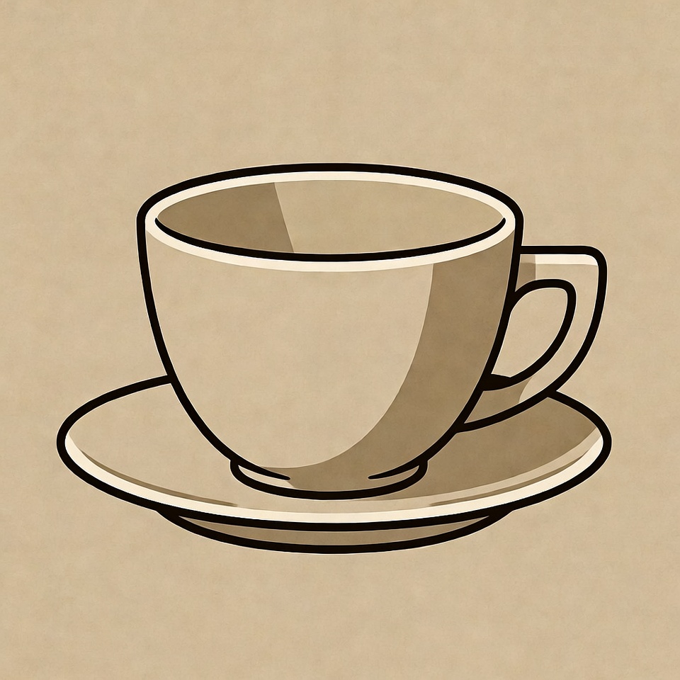 A simple line-drawn illustration of a brown teacup with a handle sits on a matching saucer. The cup features subtle shading for depth and a smooth curved shape. The design is presented on a textured beige background.