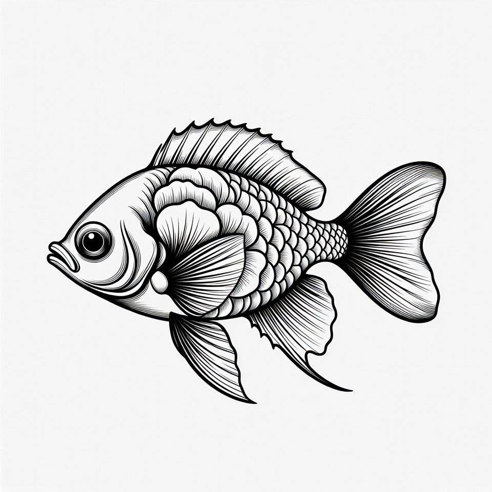 aquarium fish, aquatic, black and white, clipart, detailed fish, drawing, eye, fin, fish, illustration, isolated background, line art, ornate fins, scales, tropical fish, vector art, cichlid fish
