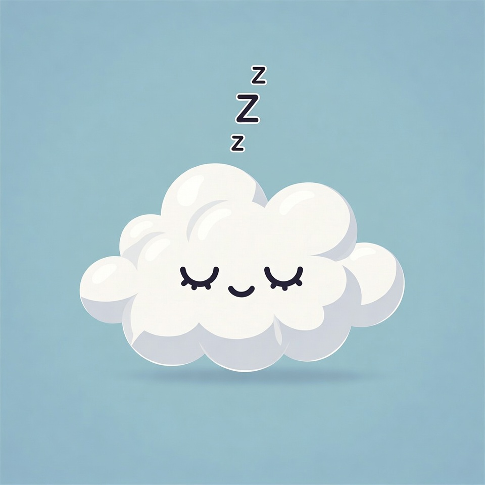 A kawaii white cloud with closed eyes and a smiling mouth floats on a light blue background. Zzz symbols above indicate it is sleeping. The illustration features a soft, cartoonish style with shadows for depth.