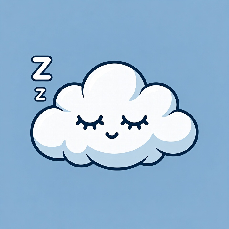 A white fluffy cloud with closed eyes, smiling mouth, and Z's floating nearby depicts a sleepy cartoon character. It features simple black outlines and cute facial expressions on a light blue background. The illustration is isolated and whimsical.