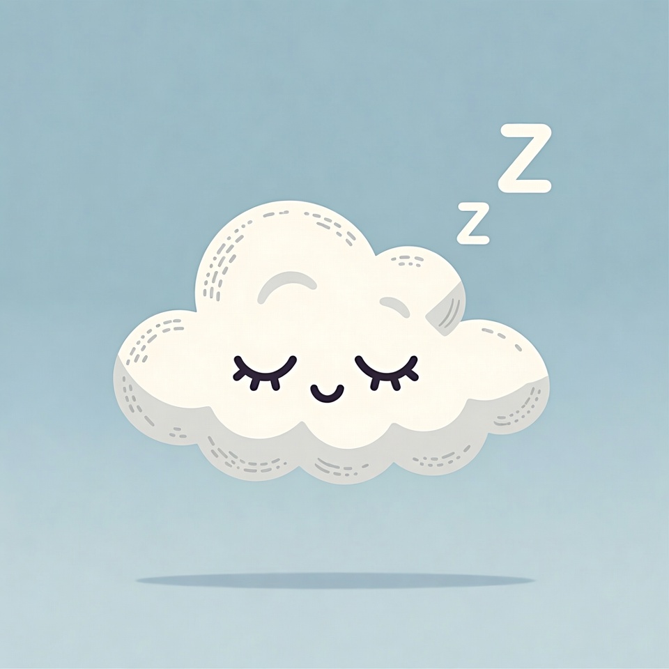 A cute white cloud illustration features closed eyes, a smiling mouth, and Zzz symbols indicating sleep. It floats on a light blue background with a subtle shadow beneath. The design is simple and cartoonish with soft outlines.