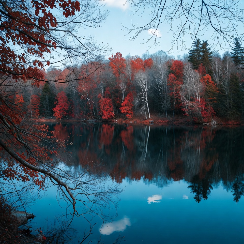 Vibrant red and orange autumn trees surround a calm blue lake, with their colorful foliage perfectly reflected in the still water. Bare branches frame the foreground, while distant evergreens add contrast under a partly cloudy sky. The serene landscape captures the peak of fall colors.