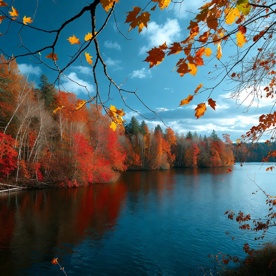 autumn scene, birch trees, blue sky, clouds, colorful trees, fall colors, fall foliage, foliage, forest, lake, landscape, maple leaves, nature, orange leaves, peaceful lake, red leaves, reflection, scenery, serene water, trees, vibrant colors, woodland, yellow leaves, autumn