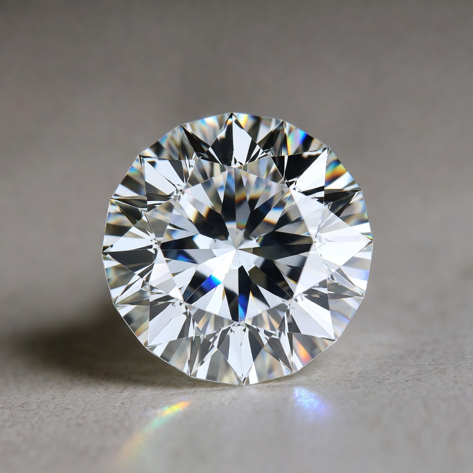 A large round brilliant-cut diamond gemstone is centered on a smooth gray background. It features multiple facets that reflect and refract light, creating colorful sparkles and a rainbow sheen. The diamond's clarity and fire are prominently displayed.