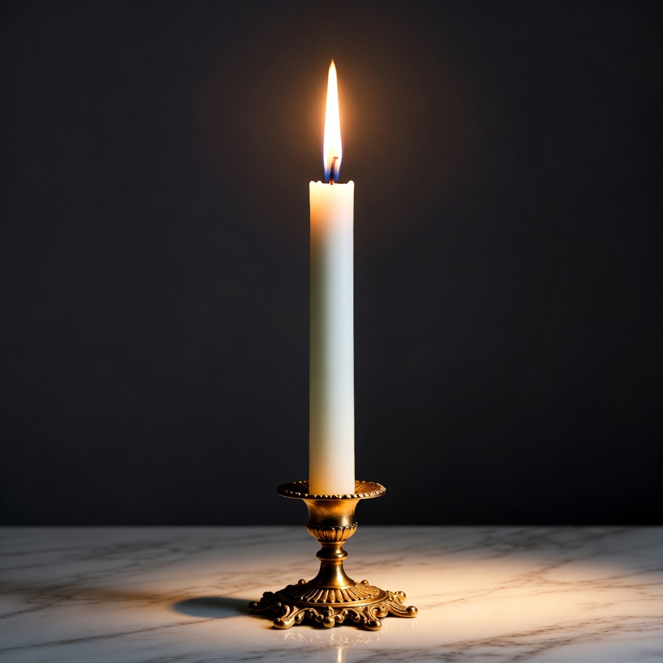 brass candlestick, burning candle, candle holder, candlelight, dark background, flame, isolated background, lit candle, marble surface, ornate holder, shadows, single candle, taper candle, warm light, wax candle, white candle, candle