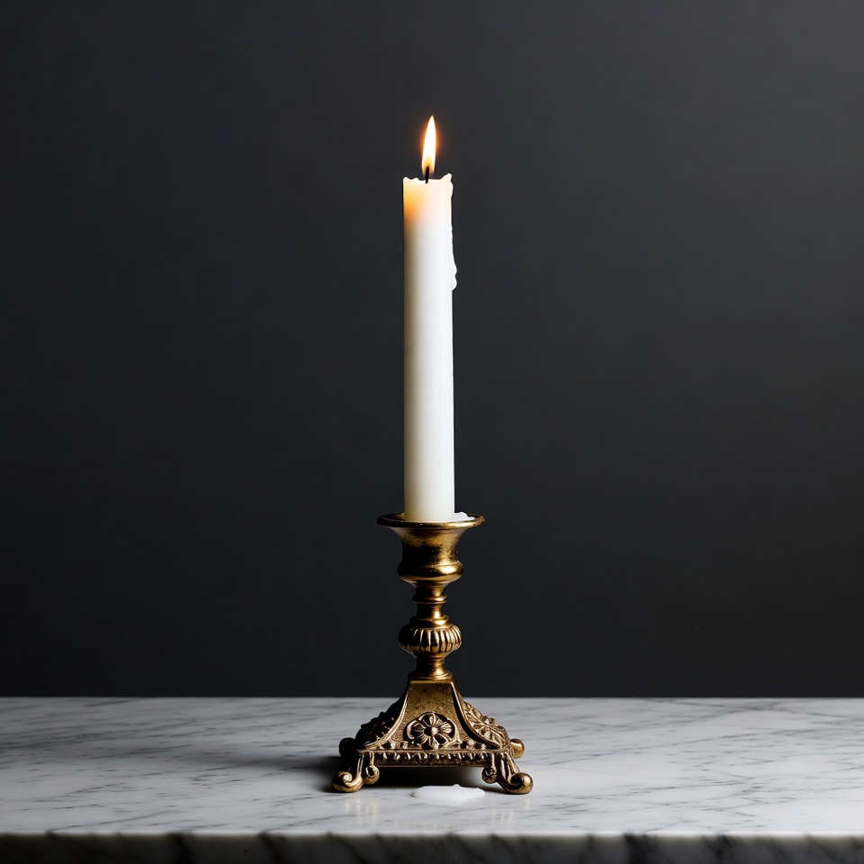brass candlestick, burning candle, candle flame, candlestick, dark background, fire, flame, isolated, lit candle, marble surface, ornate candlestick, taper candle, warm light, wax candle, white candle, candle
