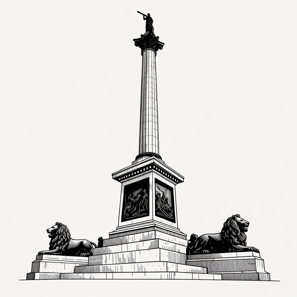animals, architecture, black and white, clipart, column, heroic statue, historical, illustration, isolated background, landmark, line art, lions, london monument, man, monument, neoclassical, ornate carvings, pedestal, statue, stone lions, tall column, telescope, victory column, Nelson column