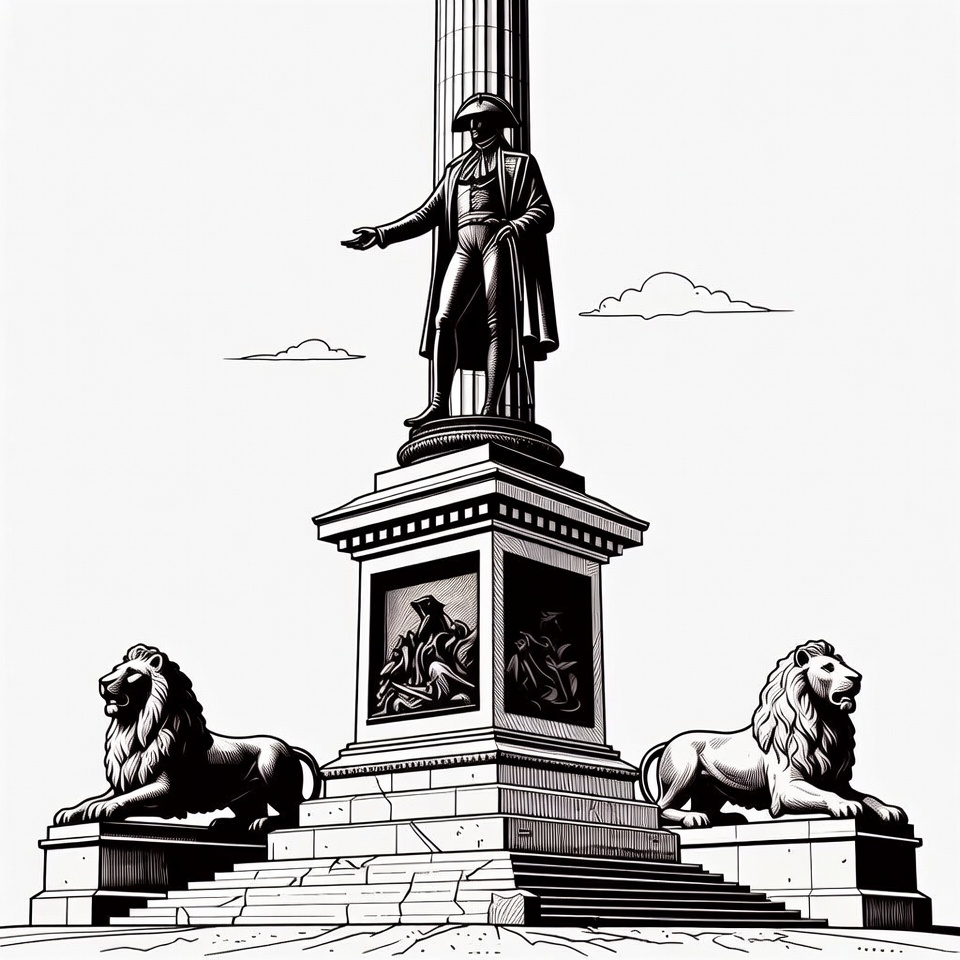 Corinthian column, French emperor, White, animals, architecture, bicorne hat, black and white, clouds, column, heroic pose, historical figure, illustration, isolated background, lions, male, monument, pedestal, relief sculptures, statue, steps, Napoleon
