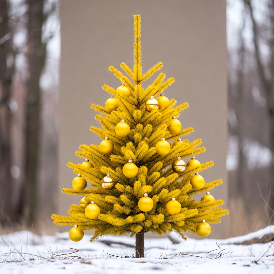 A small artificial Christmas tree painted bright yellow stands adorned with yellow ornaments in a snowy forest clearing. Bare trees surround it against a beige wall-like backdrop, with light snow on the ground. The tree features fuzzy branches and a pointed top.