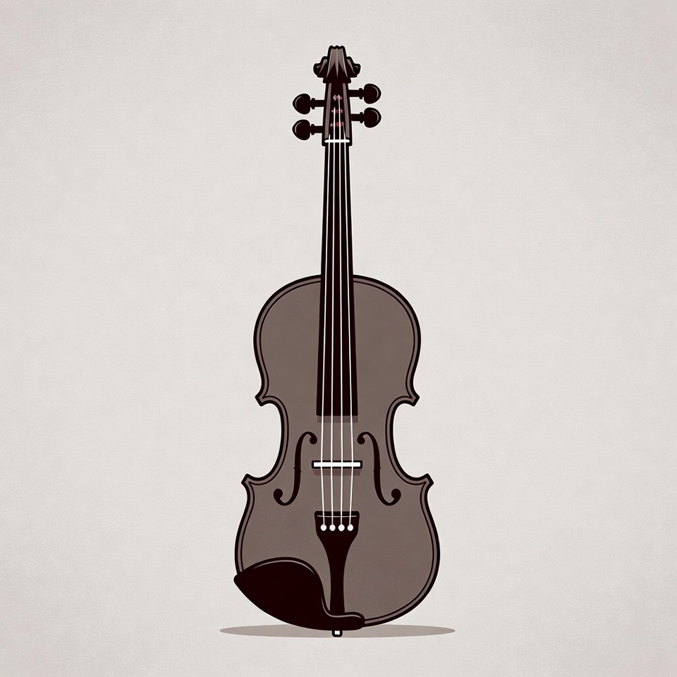 A simple line art illustration of a violin stands upright against a plain light gray background. The violin features detailed f-holes, strings, and a chin rest, rendered in shades of brown and gray. A subtle shadow beneath adds a sense of depth.