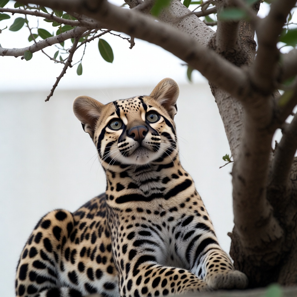 A young jaguar cub with distinctive rosette spots looks up from beneath overhanging tree branches. Its large eyes and playful expression are highlighted against a white background. The cub lies on its stomach with front paws extended forward.