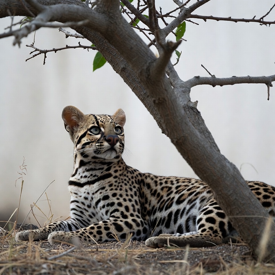 A jaguar with distinctive rosette spots lies relaxed on dry grass under a sparse tree with thin branches. Its head is tilted upward with alert eyes and ears perked. The background features a white wall and sparse vegetation.