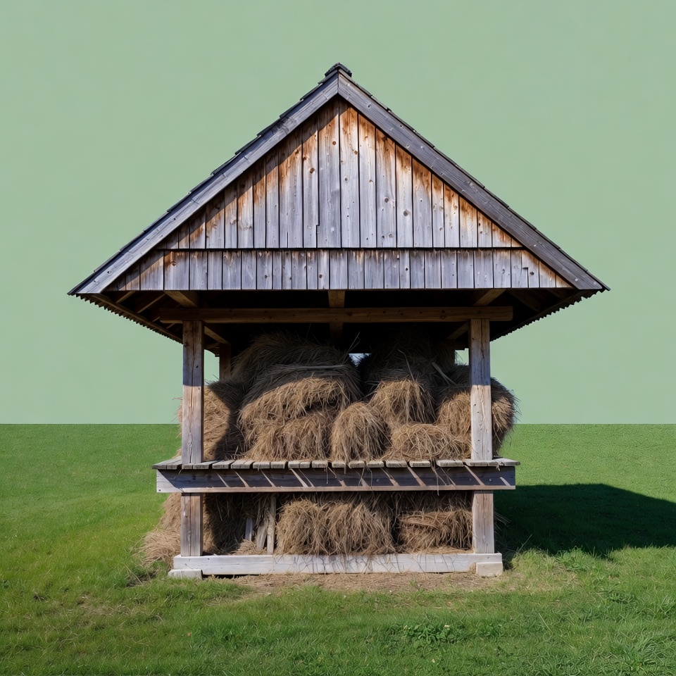 Wooden Hay Shelter with Hay Bales