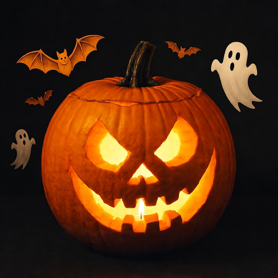 A carved jack-o'-lantern pumpkin with glowing orange eyes and jagged smiling mouth sits on a dark background. Flying bats and translucent ghosts float around it. The Halloween-themed clipart features vibrant orange pumpkin against black.