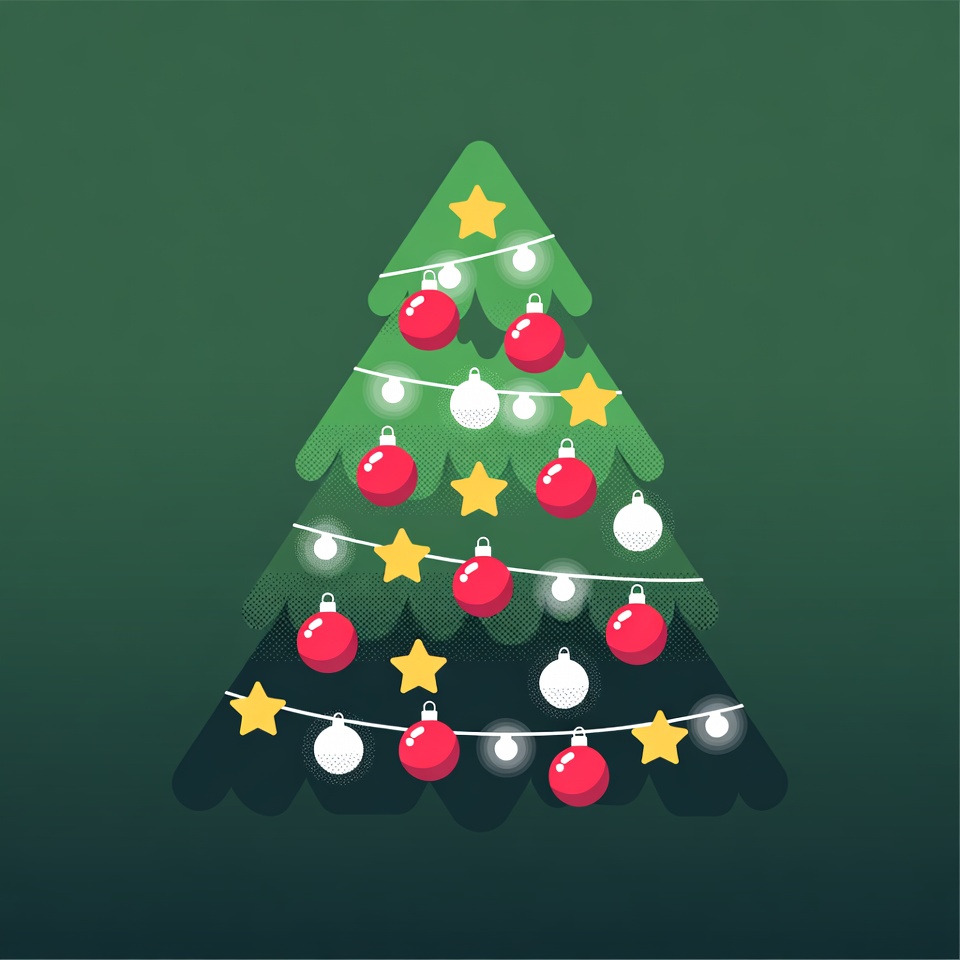 A vibrant green Christmas tree illustration features red and white ornaments hanging from its branches. Yellow stars and white lights are strung throughout the tree, topped with a large golden star. The tree stands on a solid dark green background.