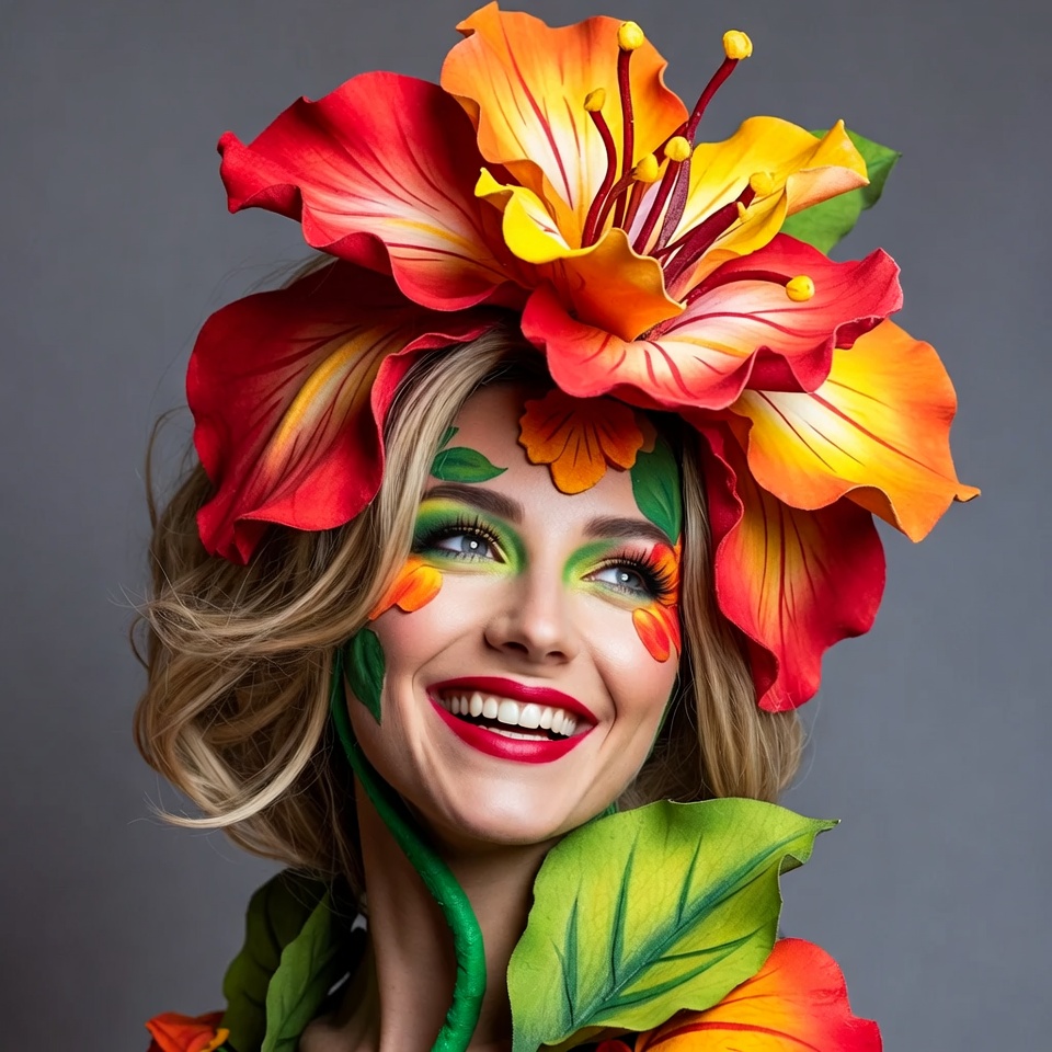 A smiling woman with blonde wavy hair wears a large vibrant flower headpiece featuring red, orange, and yellow petals along with green leaves. Her face is adorned with colorful floral makeup in matching hues, and she poses against a plain gray background. The elaborate costume gives her a floral appearance.