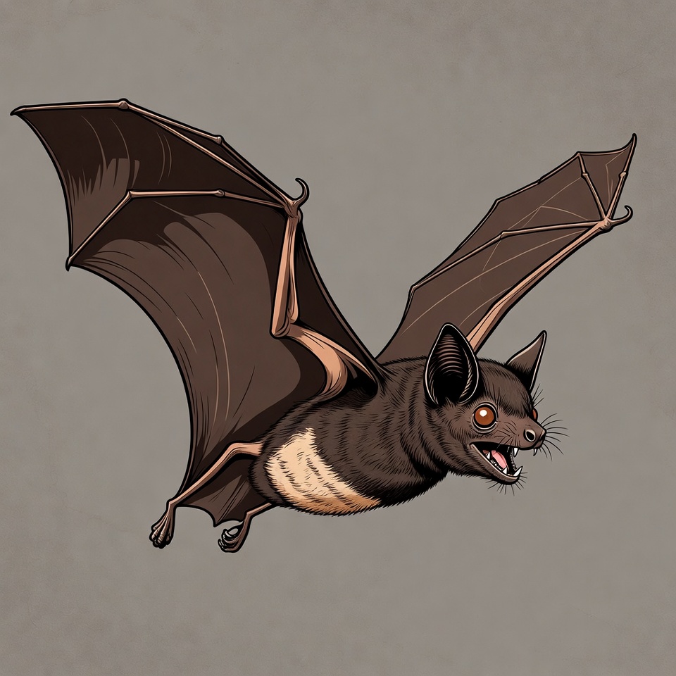 A detailed illustration of a brown bat flying with wide-spread wings against a gray background. The bat has red eyes, pointed ears, and a snarling mouth revealing sharp teeth. Its fur is depicted in shades of brown with a lighter chest.