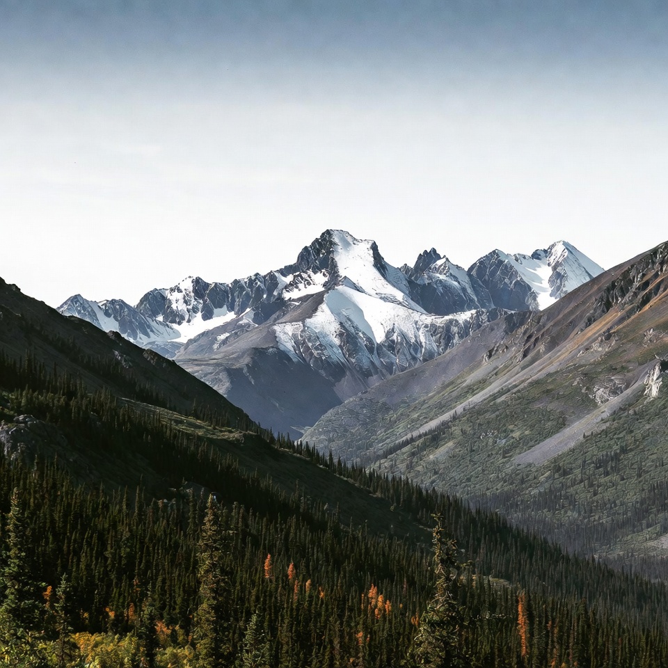 alpine scenery, autumn trees, blue sky, evergreens, forest, green valley, landscape, nature, outdoors, peaks, ridges, rocky mountains, snow-capped, snowy peaks, trees, valley, wilderness, mountains