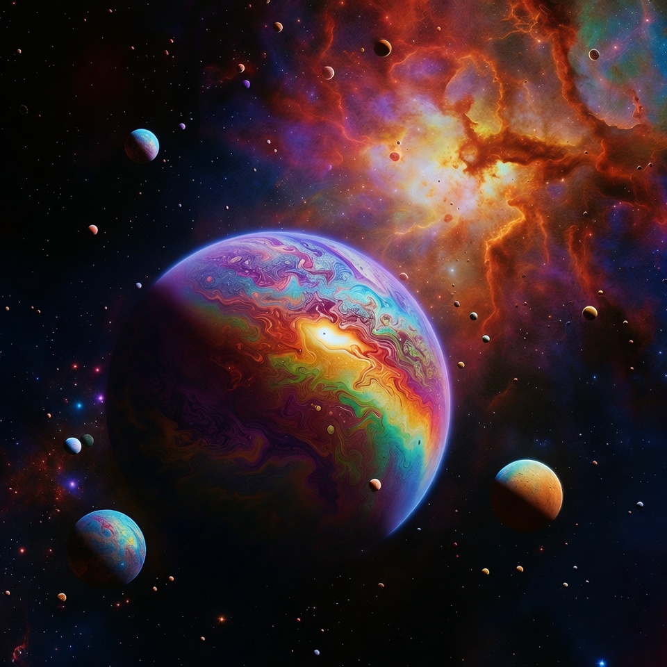 astronomy, celestial, colorful planet, cosmic, digital art, galaxy, glowing core, illustration, iridescent planet, multiple planets, nebula, orange nebula, outer space, purple planet, rainbow colors, sci-fi, space, stars, swirling surface, universe, planet