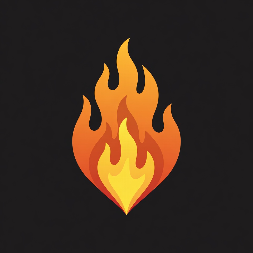 A vibrant orange and yellow flame illustration burns brightly against a solid black background. The flame features pointed, curved licks of fire forming a heart-like shape. It has a smooth, cartoonish style with bold outlines.